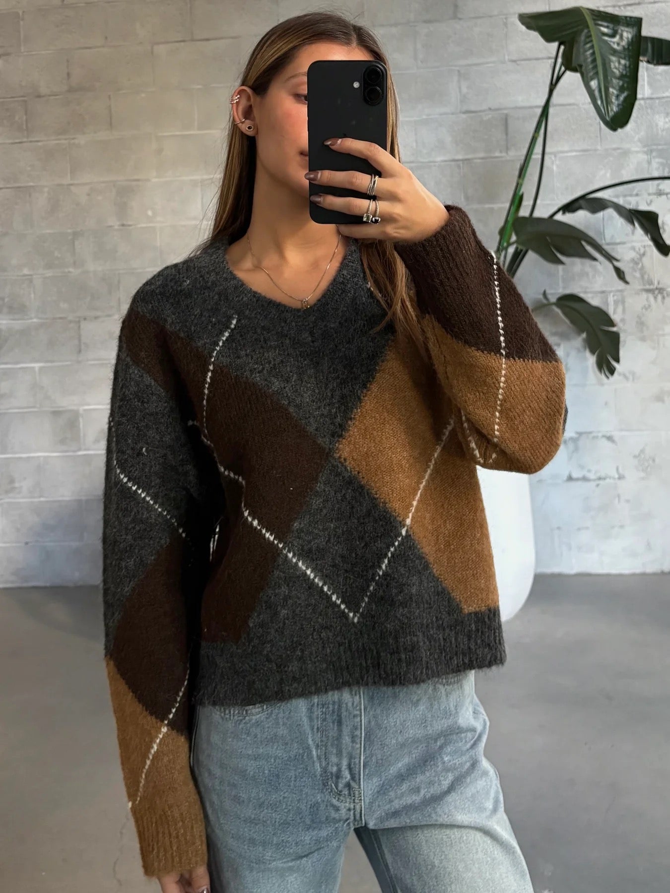 This V-Neck Argyle Patterned Sweater is the perfect sweater as we transition seasons. Made from a knit material and featuring a flattering v-neck design to keep you comfortable and stylish. Pair this with your favorite trousers for an effortlessly chic and cozy vibe.