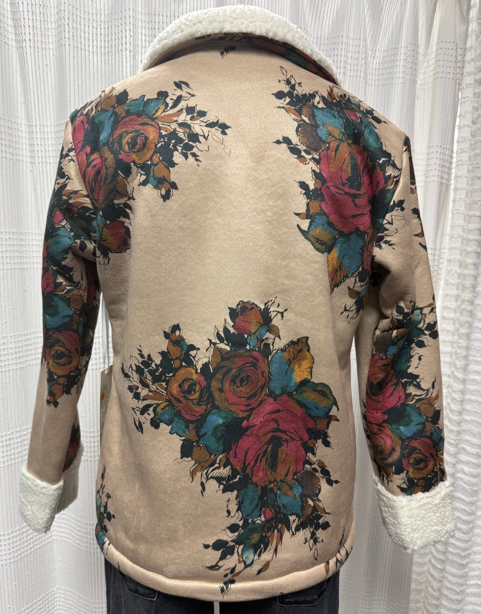 The Floral Sherpa Coat offers a perfect blend of comfort and style. Its plush, soft texture is complemented by a trendy floral design in making it a unique addition to any wardrobe. Featuring convenient welt pockets, it's both practical and fashionable. Great for cold days when you want to leave a mark while staying cosy.