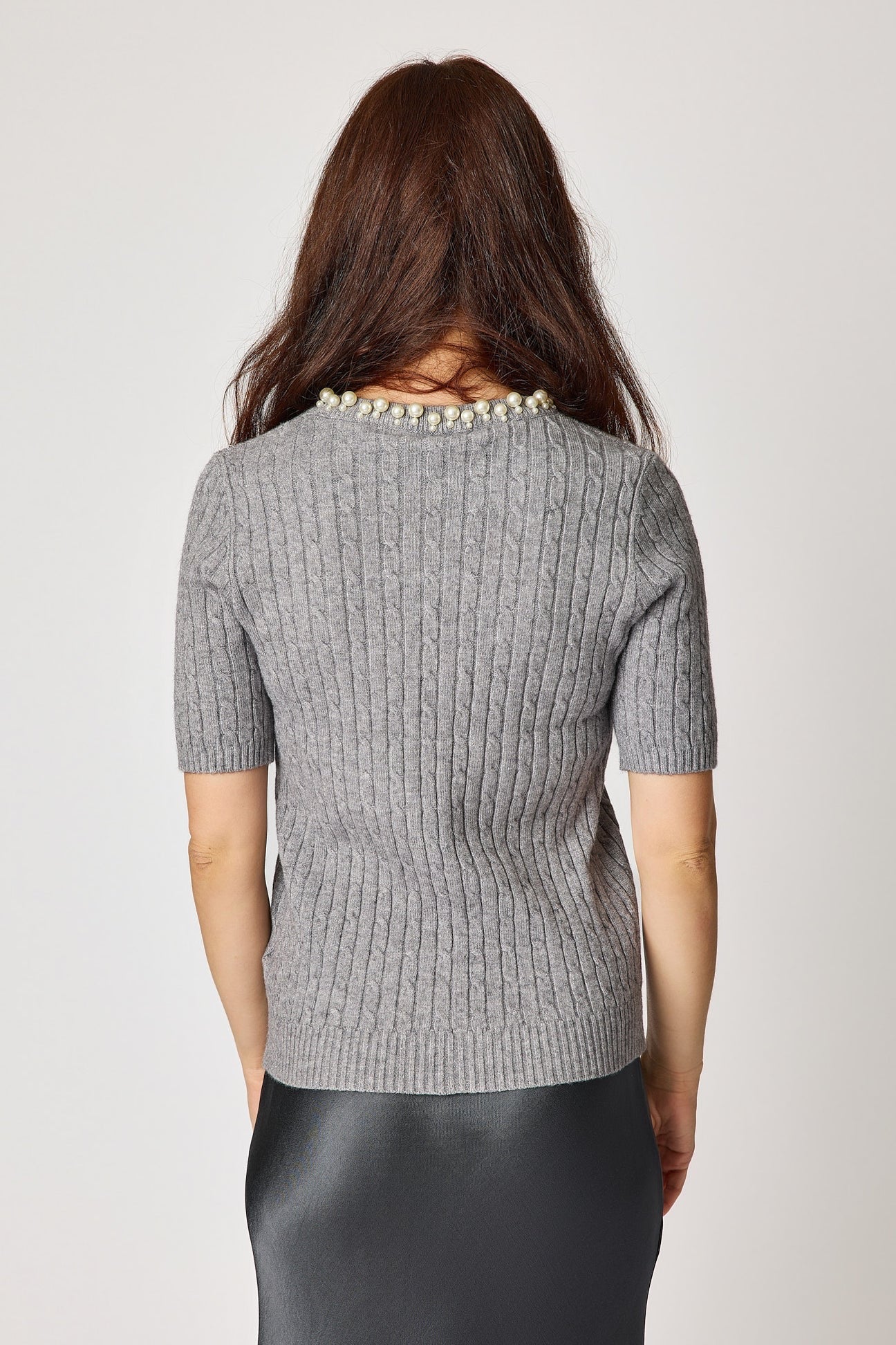 .When your sweater doubles as jewelry. The Pearl Neck Short Sleeve Sweater is crafted from a cable knit and finished with delicate pearl detailing around the neckline. It’s equal parts cozy and dressy, so you can wear it to work, then keep it on for dinner!