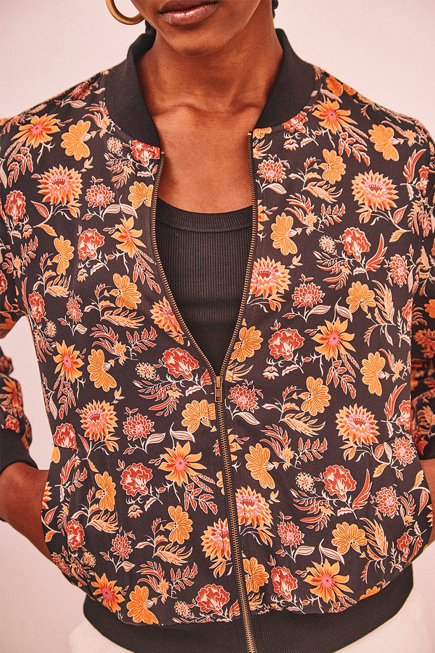 Hip-length bomber jacket. Floral print. Front zip fastening. Elastic ribbing at the bottom and cuffs.