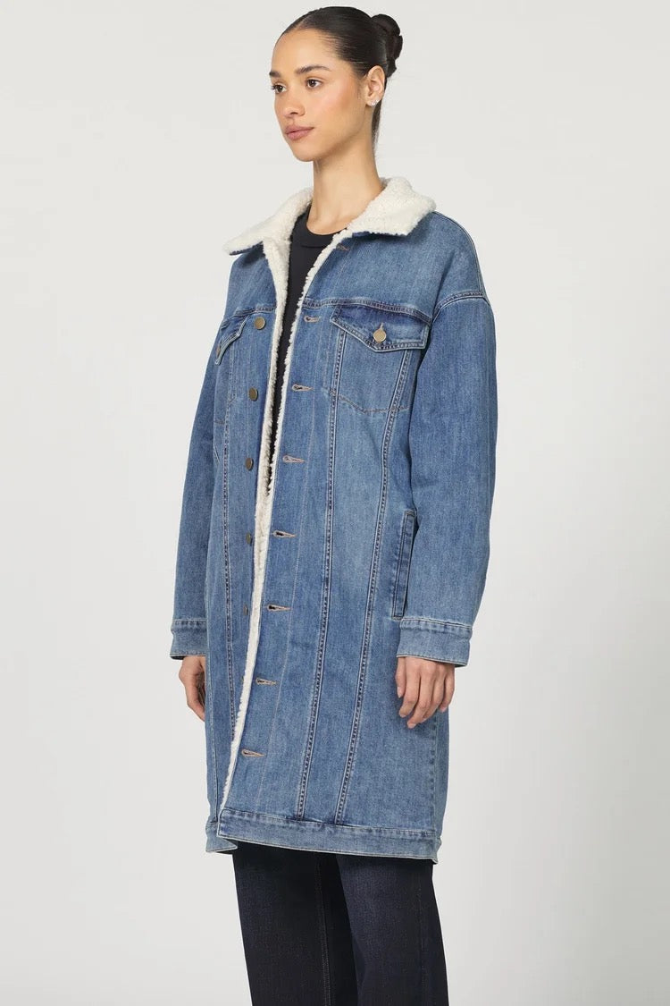 Crafted with stretch denim and sherpa, it blends sophistication with everyday wearability.